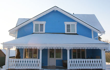 Красивый дизайн фасада загородного дома в Тарусе цвета небесной лазури с ослепительно белым декором смотрится необыкновенно. И летом и зимой он привлекает взгляд, и видно, что в нем уютно и тепло. Здесь палитра стен не смотрится холодной, скорее, здесь уместно другое значение цвета - это светлый цвет летнего неба, доверия и заботы.