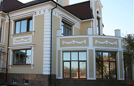 Сегодня стиль "русская усадьба" востребован, но большинство домов имеют другие формы, часто асимметричные, которые, однако, очень хорошо декорируются. Мы имеем много примеров дизайнов фасадов коттеджей, загородных домов, особняков, выполненных в классических стилях (фасады частных домов). Основной декор - это готовые изделия из нашего каталога для фасадов из полиуретана, так как ассортимент из почти 2000 элементов отражает основные мотивы классического дизайна фасада.