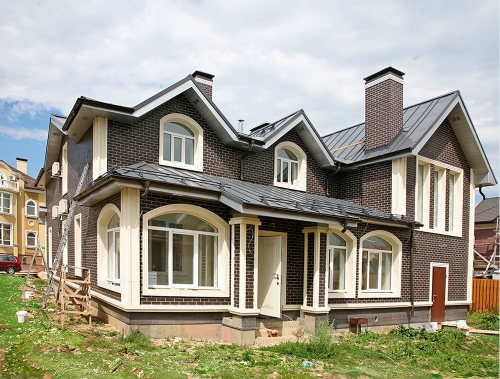 3.Облицовка фасада дома с помощью термопанелей с клинкерной плиткой с имитацией каменной, кирпичной кладки - способ "2 в 1" (утепление дома и его декорирование). Фасад в результате получается красивый, ровный, как будто выложен из кирпича. При этом такие фасады не имеют погрешностей, которые возникают при обычной кирпичной кладке: все швы идеальны, "кирпичи" имеют равномерный цвет, облицовка дома служит не менее 50 лет, не растрескивается, стена получается ровная. Кроме распространенной имитации кирпичной кладки, возможны другие варианты - отделка под натуральный камень, под каменную кладку, под штукатурку, даже под мозаику из стекла - в принципе, сейчас возможно изготовление клинкерной плитки с любой фактурой и под любой материал. С клинкерной плиткой отлично сочетается лепной классический декор из полиуретана.